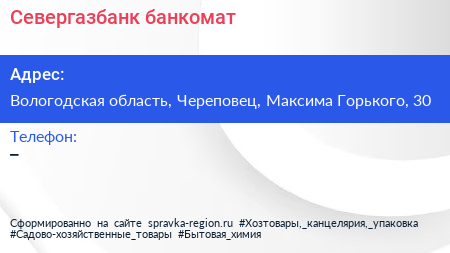 Севергазбанк, банкомат по адресу Вологодская область, Череповец, Максима Горького, 30 в дальнейшем Организация, размещена в следующих категориях: