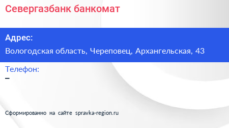 Севергазбанк, банкомат по адресу Вологодская область, Череповец, Архангельская, 43 в дальнейшем Организация, размещена в следующих категориях:
