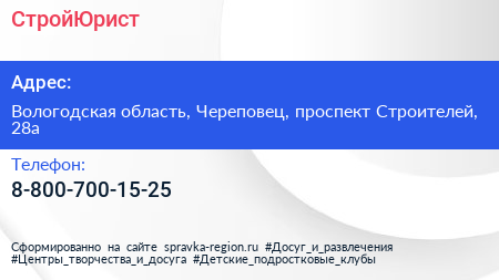 СтройЮрист по адресу Вологодская область, Череповец, проспект Строителей, 28а в дальнейшем Организация, размещена в следующих категориях: