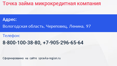Точка займа, микрокредитная компания по адресу Вологодская область, Череповец, Ленина, 97 в дальнейшем Организация, размещена в следующих категориях: