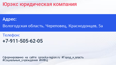 Юрэкс, юридическая компания по адресу Вологодская область, Череповец, Краснодонцев, 5а в дальнейшем Организация, размещена в следующих категориях: