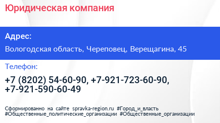 Юридическая компания по адресу Вологодская область, Череповец, Верещагина, 45 в дальнейшем Организация, размещена в следующих категориях: