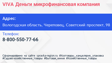 VIVA Деньги, микрофинансовая компания по адресу Вологодская область, Череповец, Советский проспект, 98 в дальнейшем Организация, размещена в следующих категориях: