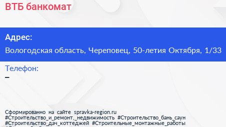 ВТБ, банкомат по адресу Вологодская область, Череповец, 50-летия Октября, 1/33 в дальнейшем Организация, размещена в следующих категориях:
