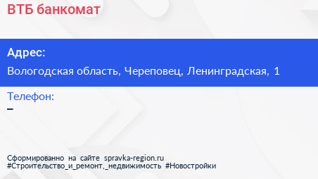 ВТБ, банкомат по адресу Вологодская область, Череповец, Ленинградская, 1 в дальнейшем Организация, размещена в следующих категориях: