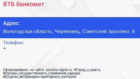 ВТБ, банкомат по адресу Вологодская область, Череповец, Советский проспект, 8 в дальнейшем Организация, размещена в следующих категориях: