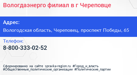 Вологдаэнерго, филиал в г. Череповце по адресу Вологодская область, Череповец, проспект Победы, 65 в дальнейшем Организация, размещена в следующих категориях: