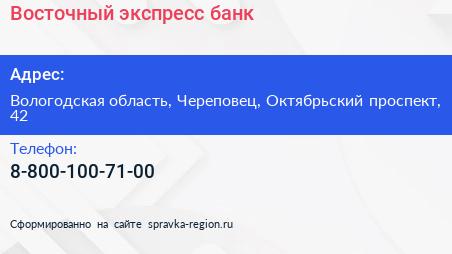 Восточный экспресс банк по адресу Вологодская область, Череповец, Октябрьский проспект, 42 в дальнейшем Организация, размещена в следующих категориях: