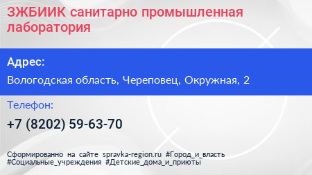 ЗЖБИИК, санитарно-промышленная лаборатория по адресу Вологодская область, Череповец, Окружная, 2 в дальнейшем Организация, размещена в следующих категориях: