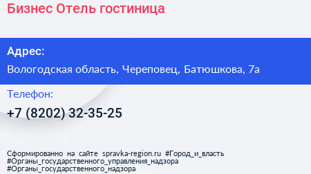 Бизнес Отель, гостиница по адресу Вологодская область, Череповец, Батюшкова, 7а в дальнейшем Организация, размещена в следующих категориях: