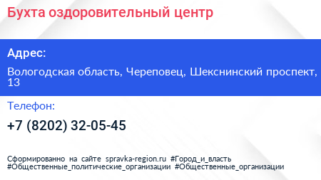 Бухта, оздоровительный центр по адресу Вологодская область, Череповец, Шекснинский проспект, 13 в дальнейшем Организация, размещена в следующих категориях: