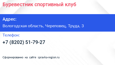 Буревестник, спортивный клуб по адресу Вологодская область, Череповец, Труда, 3 в дальнейшем Организация, размещена в следующих категориях: