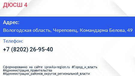 ДЮСШ №4 по адресу Вологодская область, Череповец, Командарма Белова, 49 в дальнейшем Организация, размещена в следующих категориях: