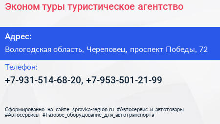 Эконом туры, туристическое агентство по адресу Вологодская область, Череповец, проспект Победы, 72 в дальнейшем Организация, размещена в следующих категориях: