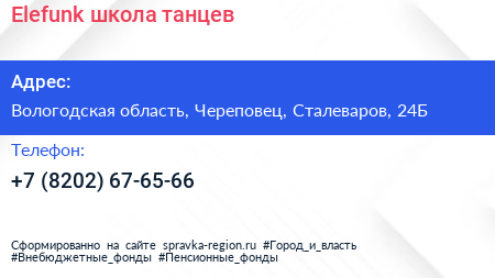 Elefunk, школа танцев по адресу Вологодская область, Череповец, Сталеваров, 24Б в дальнейшем Организация, размещена в следующих категориях: