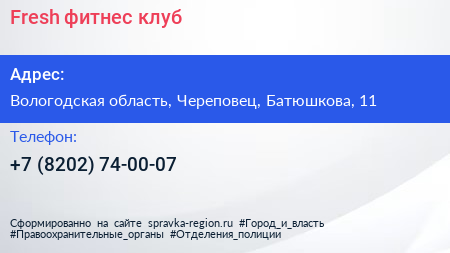 Fresh, фитнес-клуб по адресу Вологодская область, Череповец, Батюшкова, 11 в дальнейшем Организация, размещена в следующих категориях: