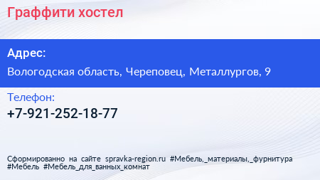 Граффити, хостел по адресу Вологодская область, Череповец, Металлургов, 9 в дальнейшем Организация, размещена в следующих категориях: