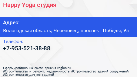 Happy Yoga, студия по адресу Вологодская область, Череповец, проспект Победы, 95 в дальнейшем Организация, размещена в следующих категориях:
