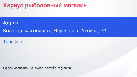 Хариус, рыболовный магазин по адресу Вологодская область, Череповец, Ленина, 73 в дальнейшем Организация, размещена в следующих категориях: