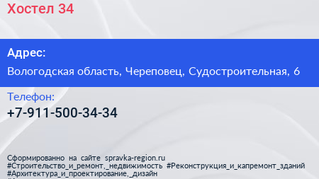Хостел 34 по адресу Вологодская область, Череповец, Судостроительная, 6 в дальнейшем Организация, размещена в следующих категориях: