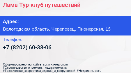 Лама-Тур, клуб путешествий по адресу Вологодская область, Череповец, Пионерская, 15 в дальнейшем Организация, размещена в следующих категориях: