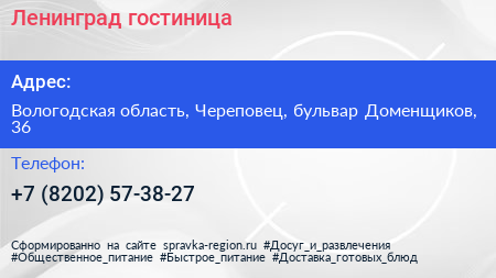 Ленинград, гостиница по адресу Вологодская область, Череповец, бульвар Доменщиков, 36 в дальнейшем Организация, размещена в следующих категориях: