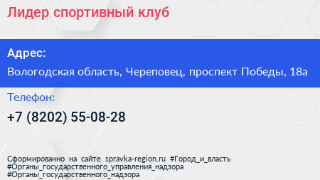 Лидер, спортивный клуб по адресу Вологодская область, Череповец, проспект Победы, 18а в дальнейшем Организация, размещена в следующих категориях: