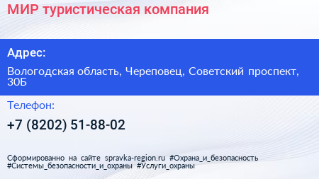 МИР, туристическая компания по адресу Вологодская область, Череповец, Советский проспект, 30Б в дальнейшем Организация, размещена в следующих категориях: