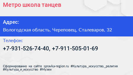 Метро, школа танцев по адресу Вологодская область, Череповец, Сталеваров, 32 в дальнейшем Организация, размещена в следующих категориях:
