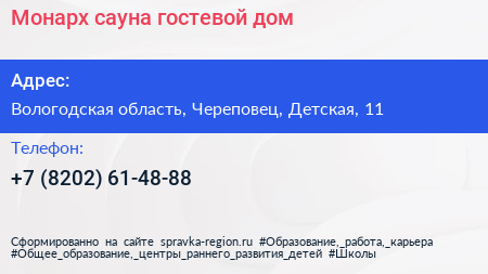 Монарх, сауна-гостевой дом по адресу Вологодская область, Череповец, Детская, 11 в дальнейшем Организация, размещена в следующих категориях:
