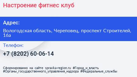 Настроение, фитнес-клуб по адресу Вологодская область, Череповец, проспект Строителей, 16а в дальнейшем Организация, размещена в следующих категориях: