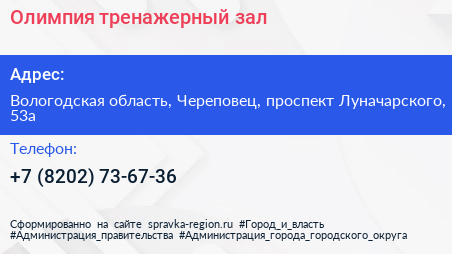 Олимпия, тренажерный зал по адресу Вологодская область, Череповец, проспект Луначарского, 53а в дальнейшем Организация, размещена в следующих категориях: