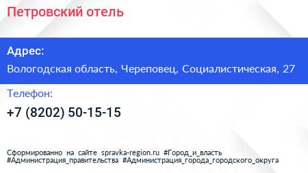 Петровский, отель по адресу Вологодская область, Череповец, Социалистическая, 27 в дальнейшем Организация, размещена в следующих категориях: