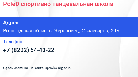 PoleD, спортивно-танцевальная школа по адресу Вологодская область, Череповец, Сталеваров, 24Б в дальнейшем Организация, размещена в следующих категориях: