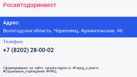 Росавтодоринвест по адресу Вологодская область, Череповец, Архангельская, 46 в дальнейшем Организация, размещена в следующих категориях: