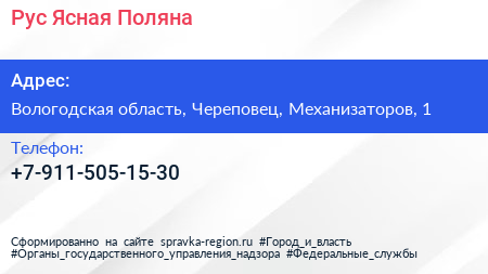 Рус-Ясная Поляна по адресу Вологодская область, Череповец, Механизаторов, 1 в дальнейшем Организация, размещена в следующих категориях: