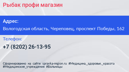 Рыбак-профи, магазин по адресу Вологодская область, Череповец, проспект Победы, 162 в дальнейшем Организация, размещена в следующих категориях: