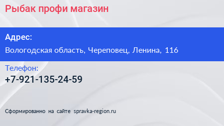 Рыбак-профи, магазин по адресу Вологодская область, Череповец, Ленина, 116 в дальнейшем Организация, размещена в следующих категориях: