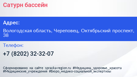 Сатурн, бассейн по адресу Вологодская область, Череповец, Октябрьский проспект, 38 в дальнейшем Организация, размещена в следующих категориях:
