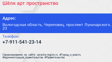 Шёлк, арт-пространство по адресу Вологодская область, Череповец, проспект Луначарского, 23 в дальнейшем Организация, размещена в следующих категориях: