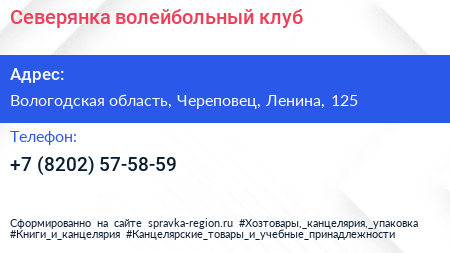 Северянка, волейбольный клуб по адресу Вологодская область, Череповец, Ленина, 125 в дальнейшем Организация, размещена в следующих категориях: