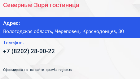 Северные Зори, гостиница по адресу Вологодская область, Череповец, Краснодонцев, 30 в дальнейшем Организация, размещена в следующих категориях: