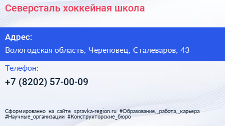 Северсталь, хоккейная школа по адресу Вологодская область, Череповец, Сталеваров, 43 в дальнейшем Организация, размещена в следующих категориях: