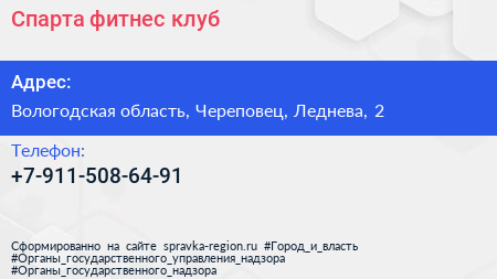 Спарта, фитнес-клуб по адресу Вологодская область, Череповец, Леднева, 2 в дальнейшем Организация, размещена в следующих категориях: