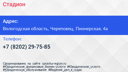 Стадион по адресу Вологодская область, Череповец, Пионерская, 4а в дальнейшем Организация, размещена в следующих категориях: