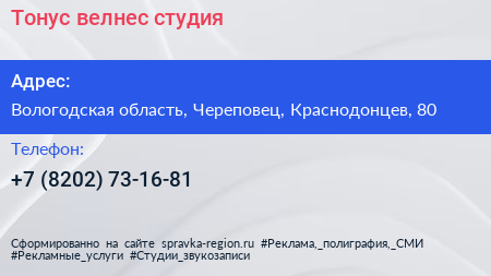 Тонус, велнес-студия по адресу Вологодская область, Череповец, Краснодонцев, 80 в дальнейшем Организация, размещена в следующих категориях: