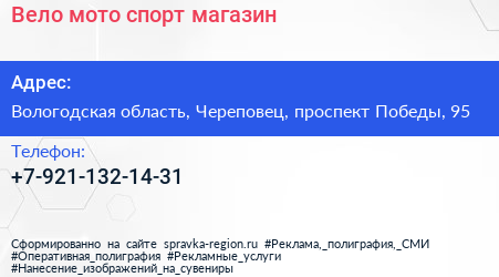 Вело-мото-спорт, магазин по адресу Вологодская область, Череповец, проспект Победы, 95 в дальнейшем Организация, размещена в следующих категориях: