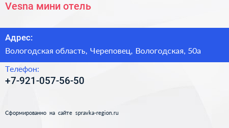 Vesna, мини-отель по адресу Вологодская область, Череповец, Вологодская, 50а в дальнейшем Организация, размещена в следующих категориях:
