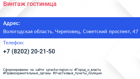 Винтаж, гостиница по адресу Вологодская область, Череповец, Советский проспект, 47 в дальнейшем Организация, размещена в следующих категориях: