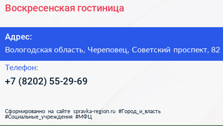 Воскресенская, гостиница по адресу Вологодская область, Череповец, Советский проспект, 82 в дальнейшем Организация, размещена в следующих категориях: